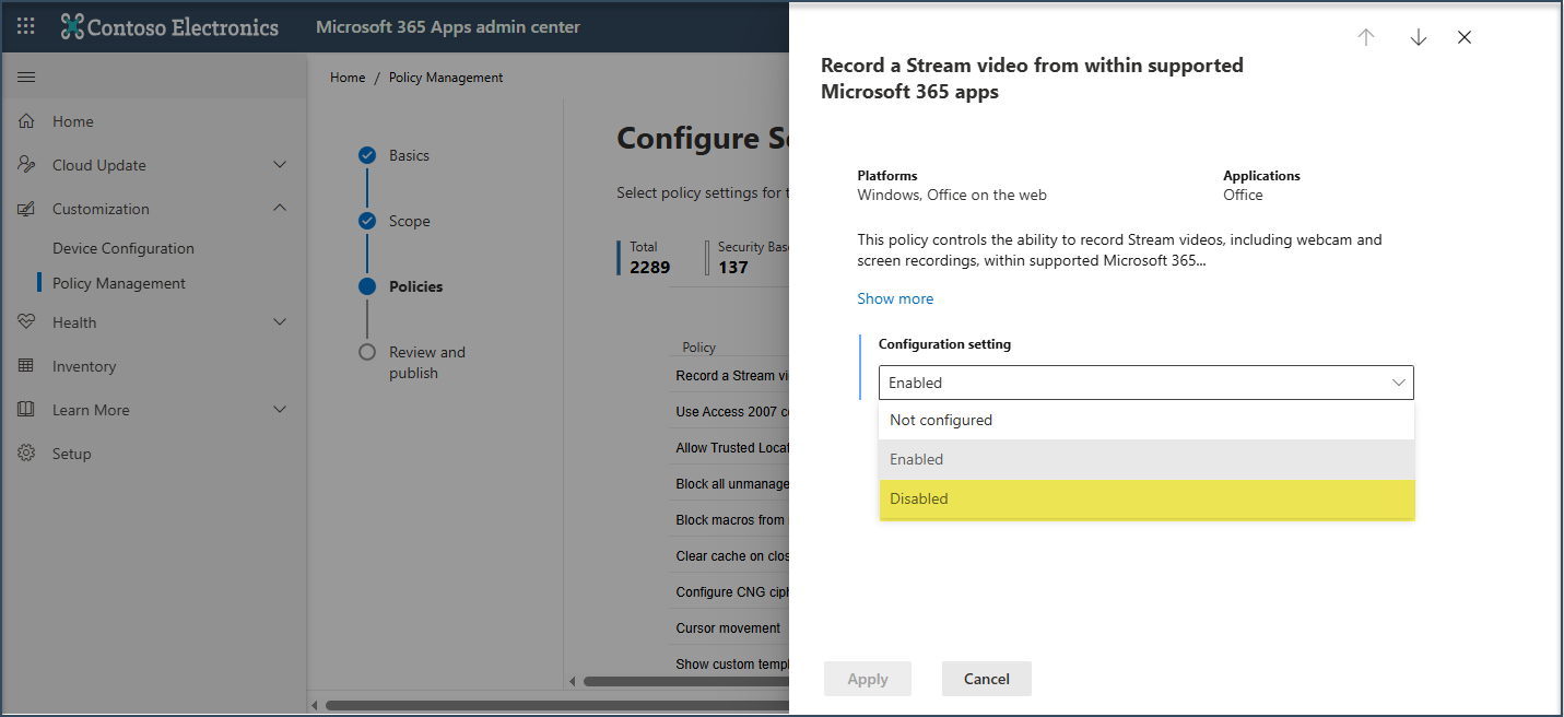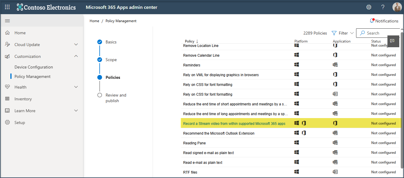 - Select the Policy ‘Record a Stream video within supported Microsoft 365 apps”