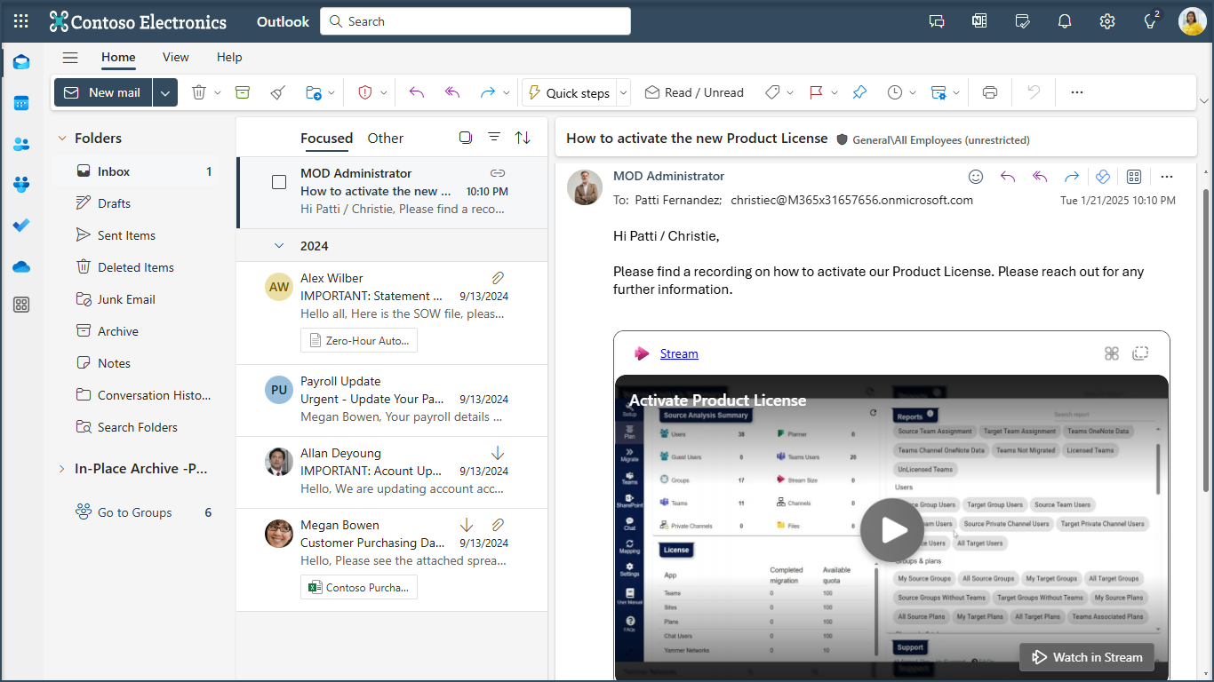- A link to the video stored in Microsoft OneDrive. When you click on it, the video opens in the Stream app.