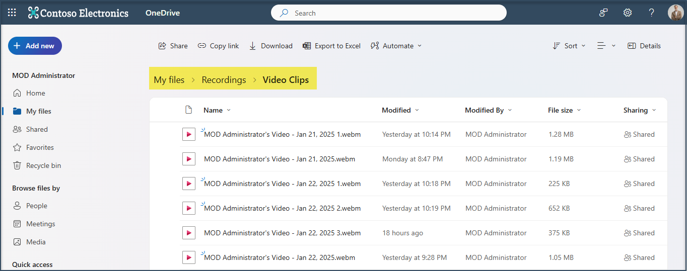 The video gets saved in the user’s OneDrive Location My files > Recordings > Video Clips.