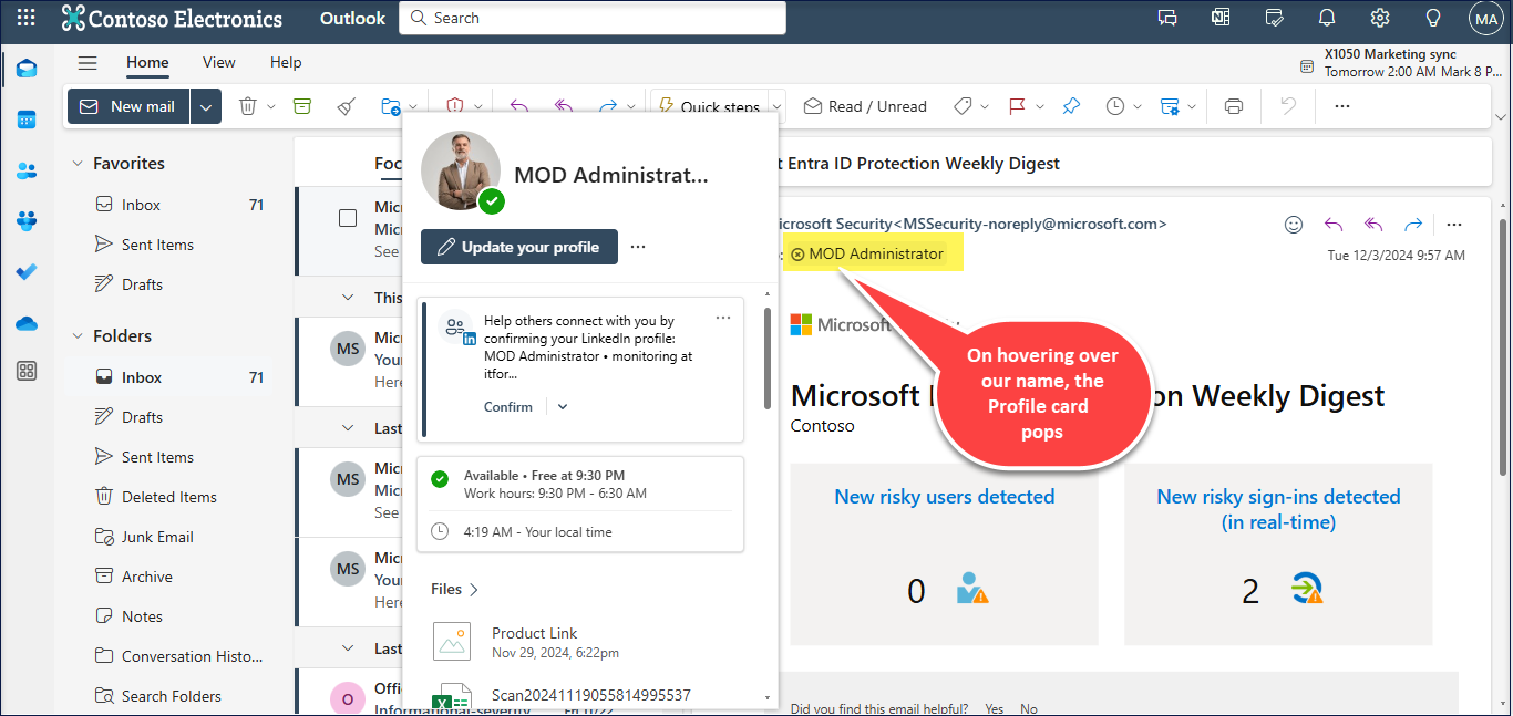 To open a profile card in Outlook, double-click / hover over the name in To or From field in any sent or received email.