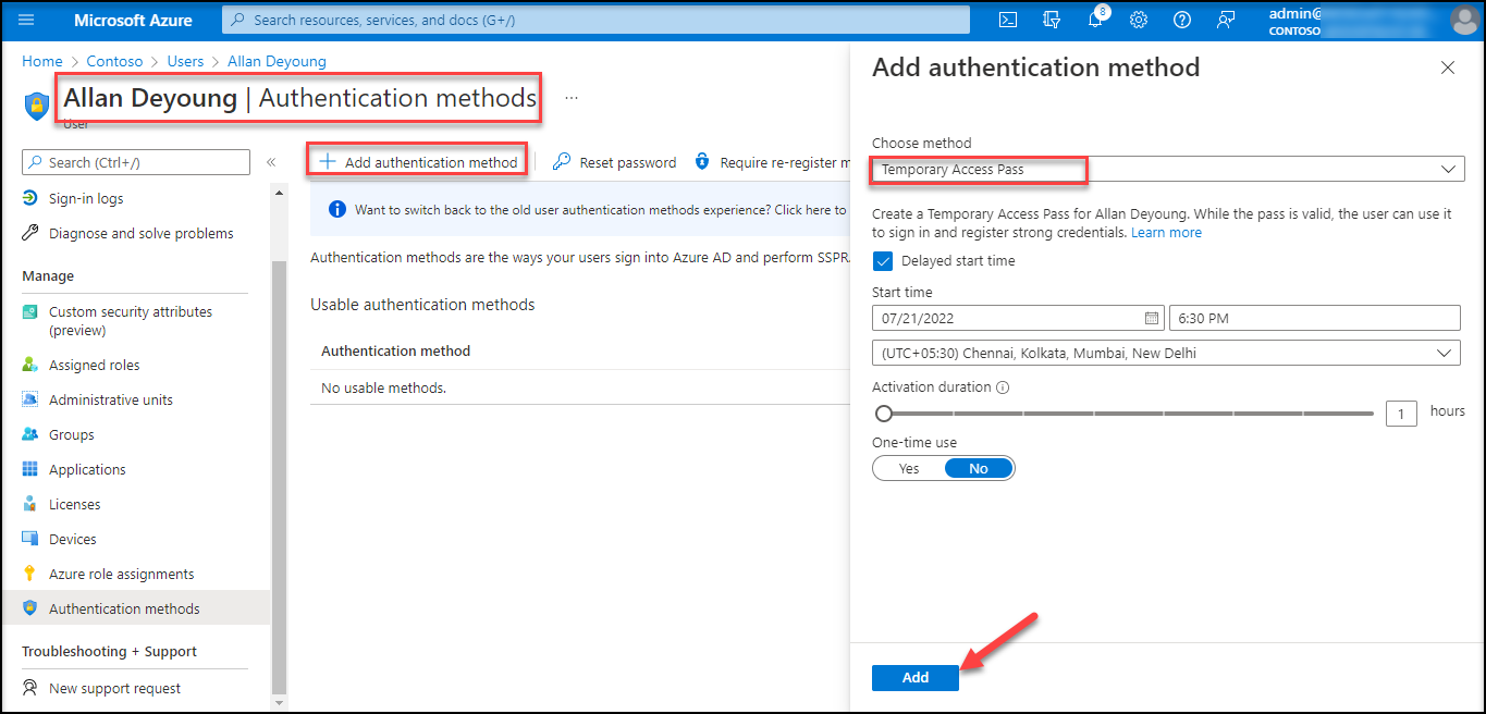 Global administrator and Authentication Policy administrator role holders are eligible to update the Temporary Access Pass authentication method policy. Follow the below steps to configure the Temporary Access Pass authentication method policy.