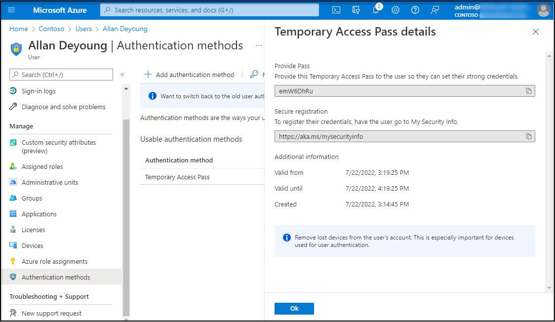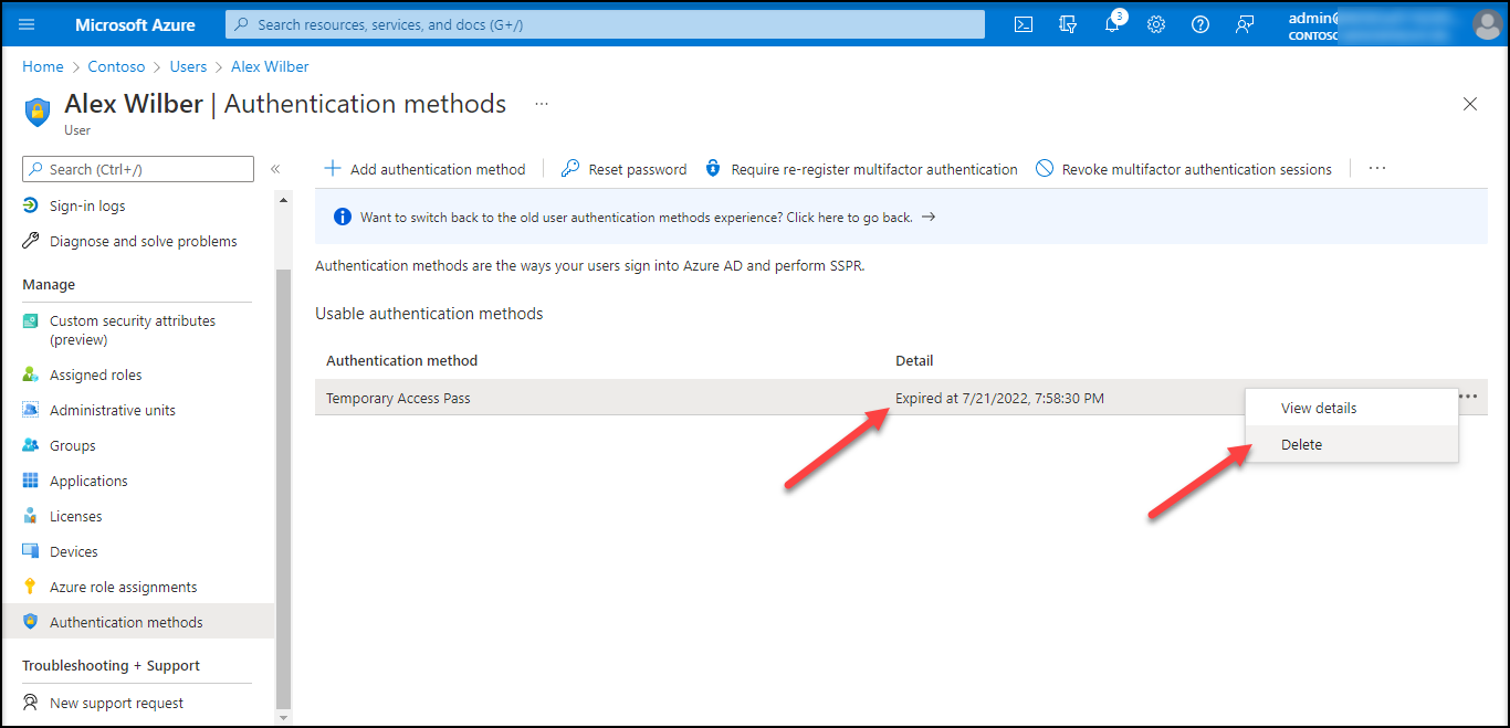 Once the Temporary Access Pass expires, admin can delete it under user -> Authentication Methods. The generated passes and their expiry time are listed – over which the admin can choose to delete the pass.