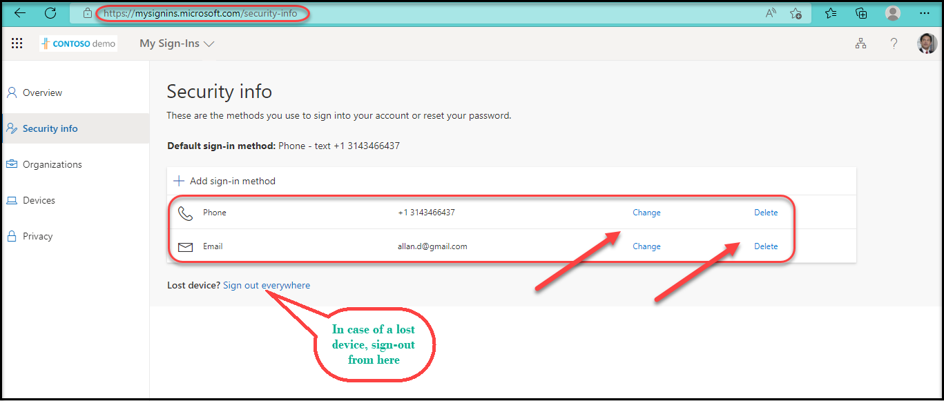 In this security portal, users who have lost their credentials or device, must make sure to remove / update the old sign-in methods.