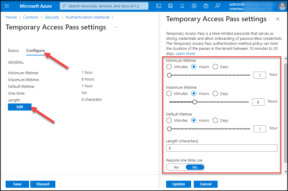 On the Configure tab, you can modify the default Temporary Access Pass settings, such as max/min lifetime, default lifetime, length & enable one-time usage. This step is optional and if you do not update, default values apply to all these parameters.