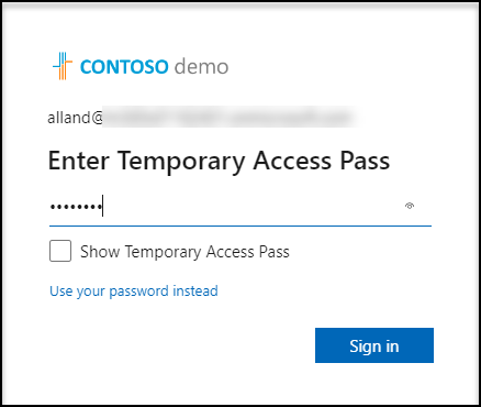 - Key-in the Temporary Access Pass that was displayed in the Azure portal.