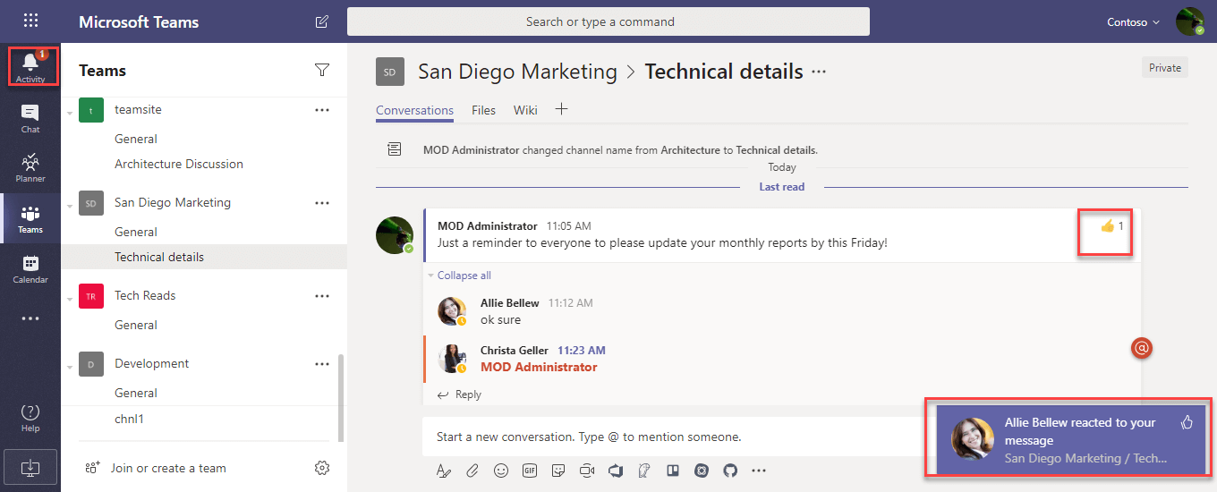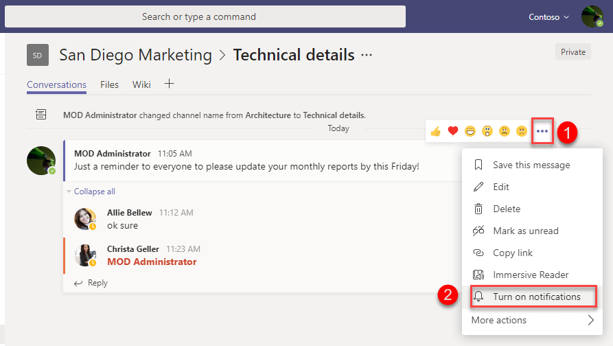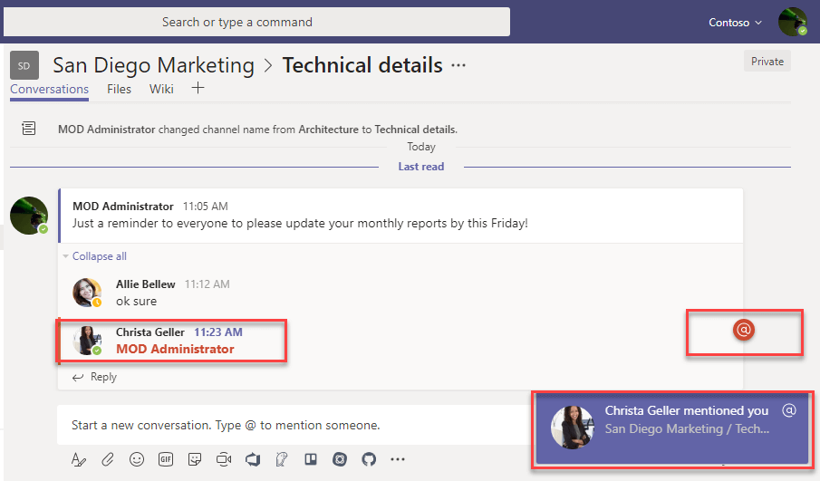 For example, Christa Geller is @mentioning MOD Administrator in his